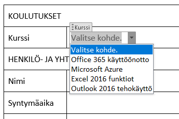 Toisen rivin tyhjään sarakkeeseen lisätään ohjausobjekti nimeltä Avattava luettelo, josta käyttäjä voi valita haluamansa kurssin.