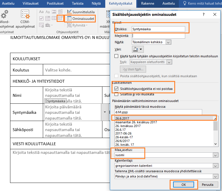Ana objektille nimi (Syntymäaika) ja rastita Sisältöohjausobjektia ei voi poistaa -kenttä. Valitse haluamasi päivämäärän muoto listasta ja tarkista että maa-asetus on oikein. Napsauta lopuksi Ok-painiketta.