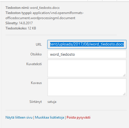 Tiedoston url: http://testiblogi.dev/wp-content/uploads/2017/08/word_tiedosto.docx